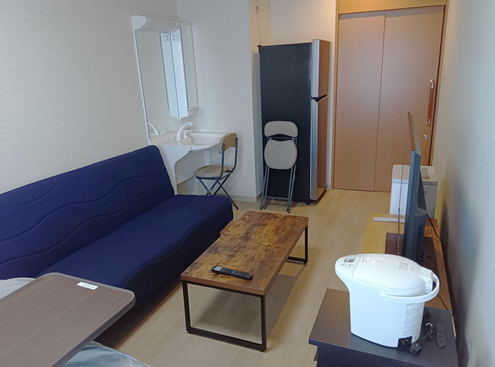 ベッド、ソファー、テレビ、冷蔵庫などゆっくり過ごすことができる設備を揃えましたので、